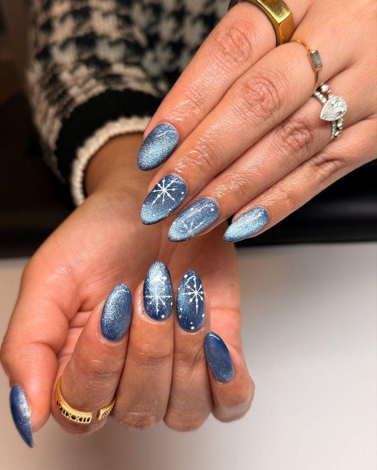 Shimmering metallic blue nails are topped with simple white snowflakes, giving a sleek and luminous frozen look. The finish feels bright, crisp, and perfect for the January start of the year.