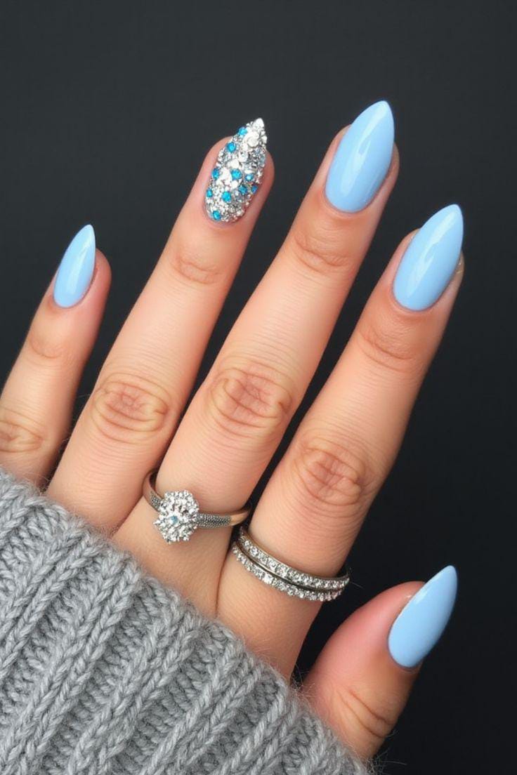 Soft pastel blue nails are paired with one fully jeweled accent nail covered in silver and blue crystals, creating a glamorous, frosty statement. It’s simple yet luxurious, bringing a touch of sparkle to a clean January winter palette.