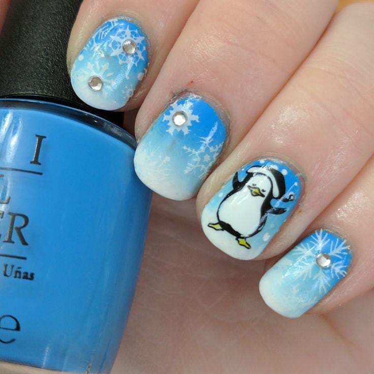 This design blends a blue-to-white winter gradient with delicate snowflakes and a cute penguin accent, giving it a fun, icy January feel. The tiny rhinestones add a frosty sparkle that keeps the whole look playful and bright.