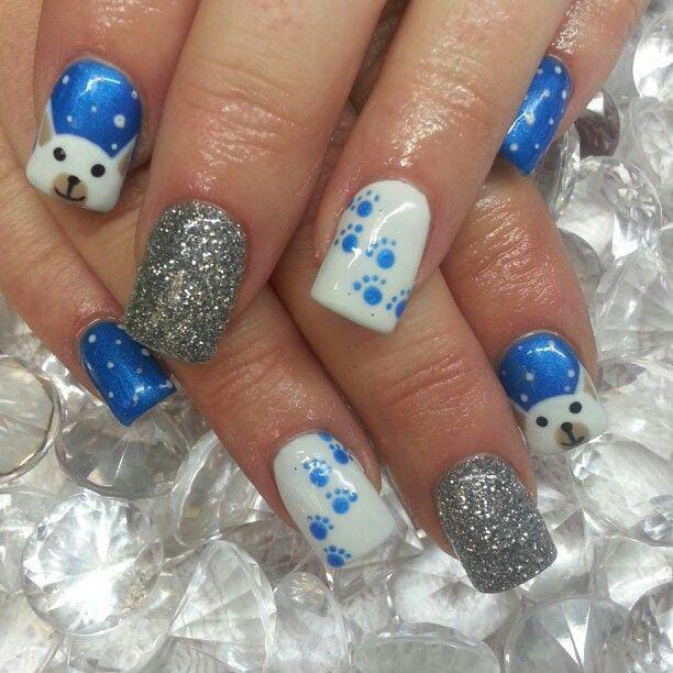 A mix of glittery silver, crisp white, and bold blue creates a lively winter theme, complete with paw-print patterns and adorable bear accents. The combination feels both cute and festive, perfect for a cozy January vibe.