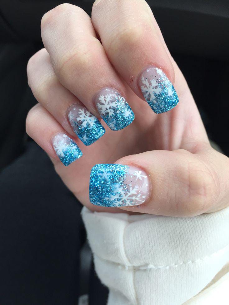 These nails feature glittery blue tips fading into soft snowflakes, capturing that magical frosty look of a fresh winter January morning. The simple gradient and shimmer make the design feel clean, bright, and seasonally perfect.