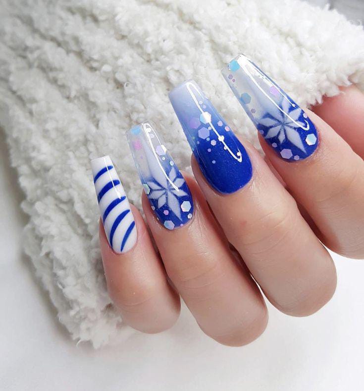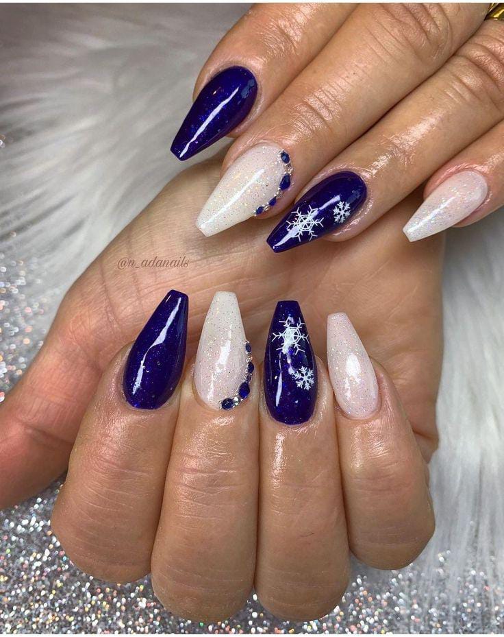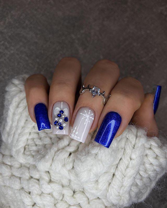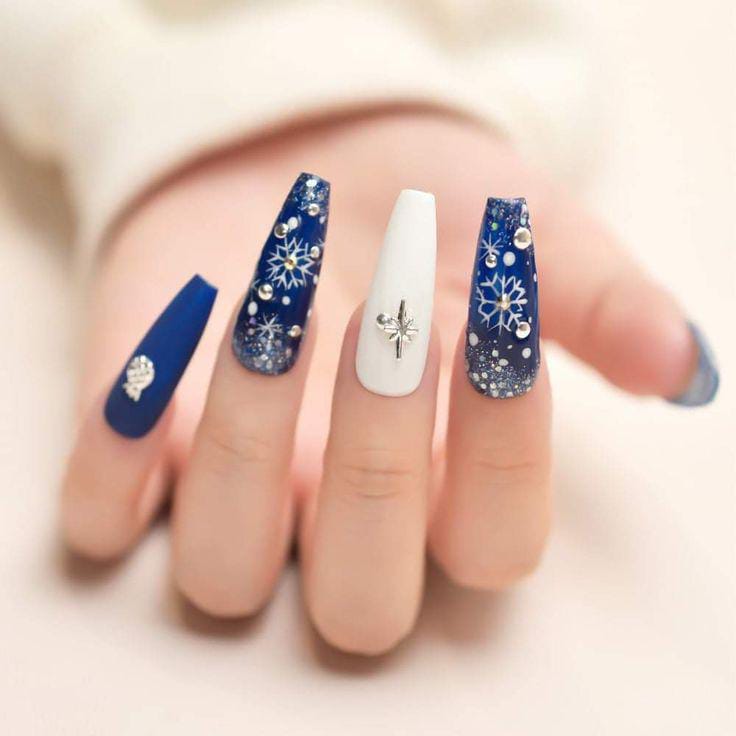 A mix of deep navy and frosty white nails brings a bold contrast, highlighted with sparkling accents and snowflakes for a glamorous winter look. The combo feels festive, dramatic, and perfect for January winter nights.