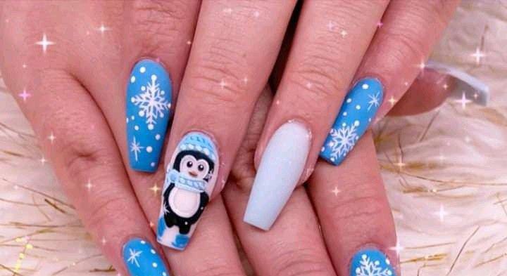 Cute and cheerful, this set features light blue nails with white snowflakes and an adorable penguin character that brings a fun, cozy winter charm. The soft pastel tones make it feel bright and friendly for January.