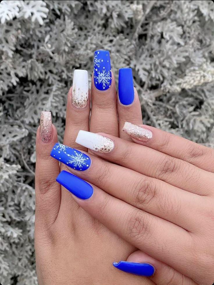 Royal blue and white nails are paired with touches of gold glitter and delicate snowflakes for a frosty yet glamorous January look. The combination feels chic and bright, echoing the shimmer of winter frost.