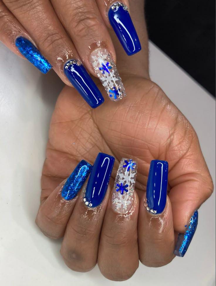 This set mixes vivid sapphire blue with clear, glitter-filled accent nails and delicate snowflakes, creating a crisp, cool design that feels fresh January vibe.