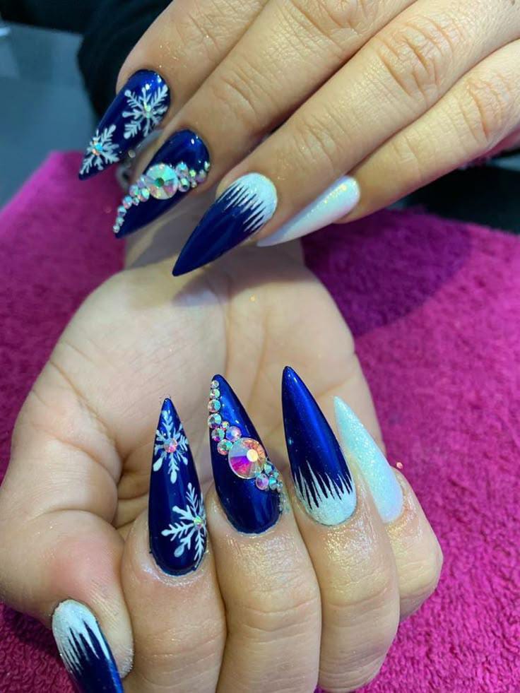 Dark blue stiletto nails decorated with white snowflakes, frosted tips, and sparkling rhinestones give this look a glamorous, icy nighttime January feel.