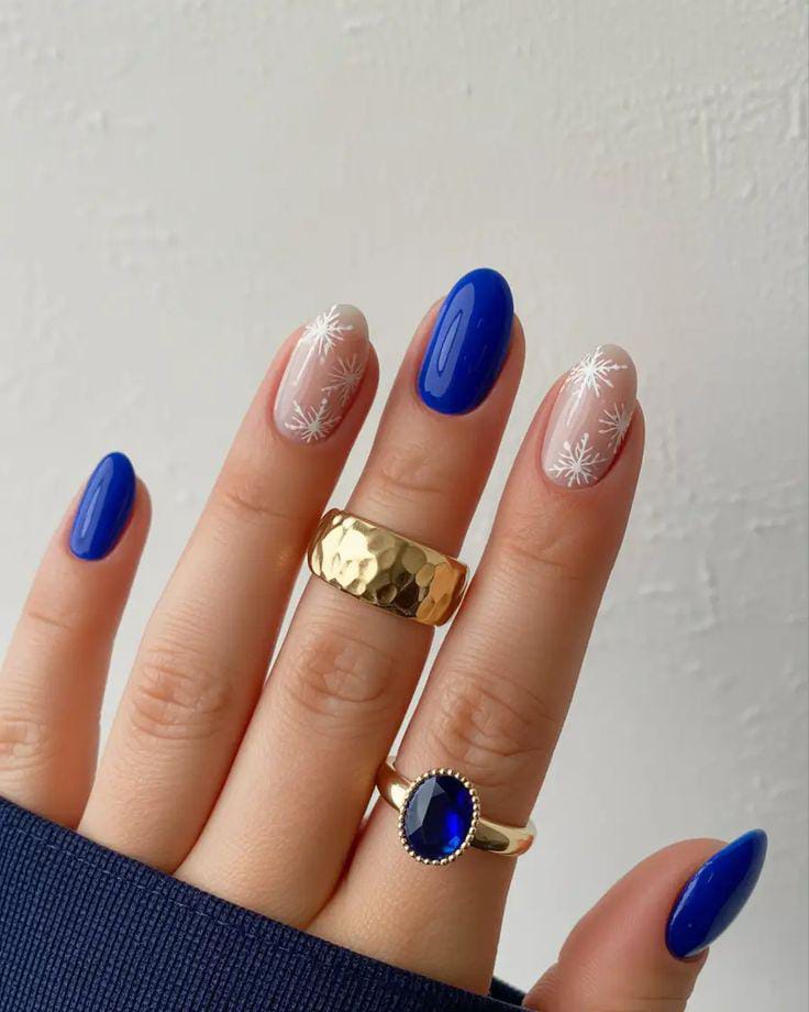 Bright royal-blue nails are paired with soft nude bases decorated with crisp white snowflakes, creating a clean but striking contrast. The look feels modern, polished, and perfect for a bold January statement.