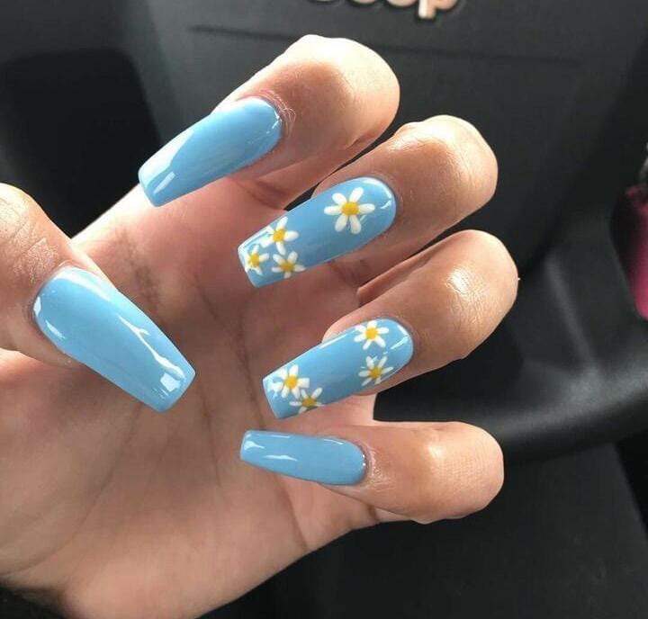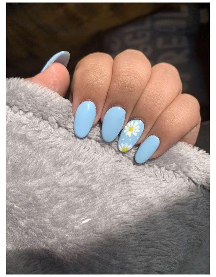 Soft sky-blue polish with delicate white daisies creates a calm, airy feel. It looks light, cheerful, and very spring-inspired.
