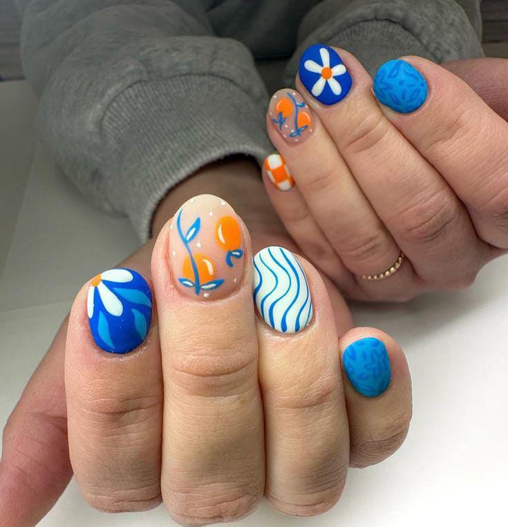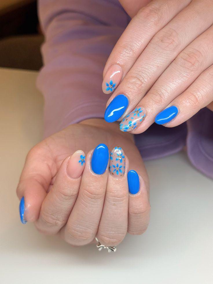 Bright royal blue nails are paired with soft nude accents and playful orange-and-blue floral art. The look feels fresh, artistic, and full of spring energy.