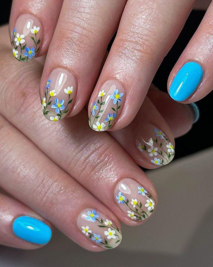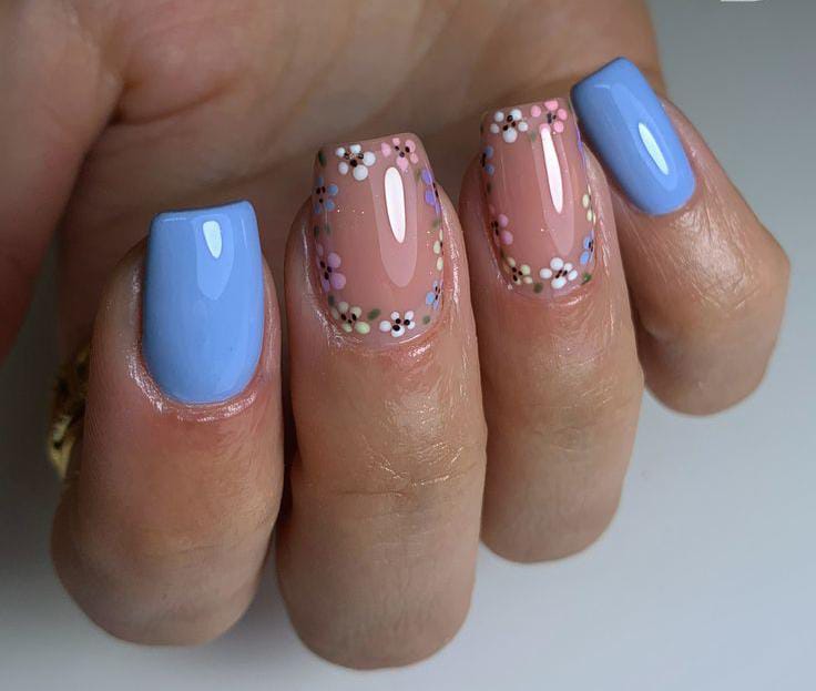 A natural base is surrounded by tiny pastel flowers, creating a soft framed effect. Solid blue nails complete the look with a gentle spring contrast.