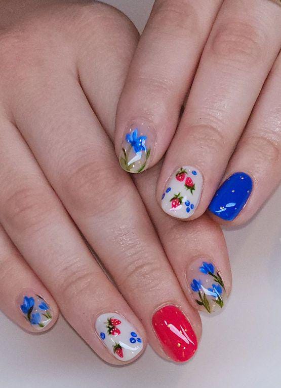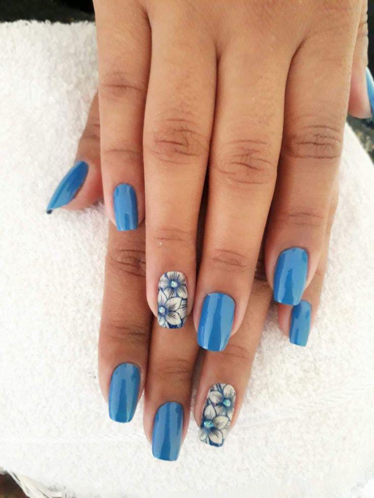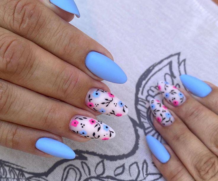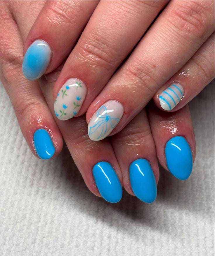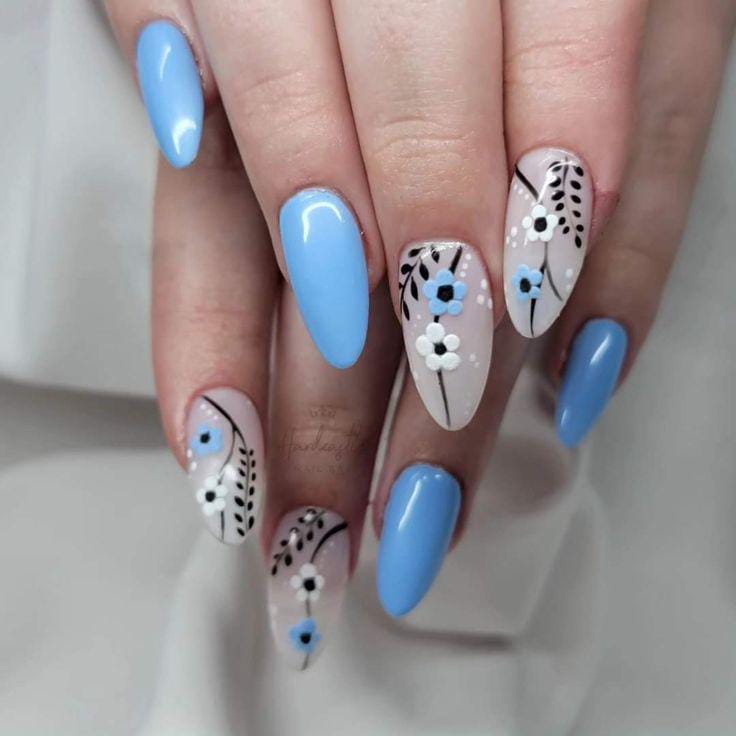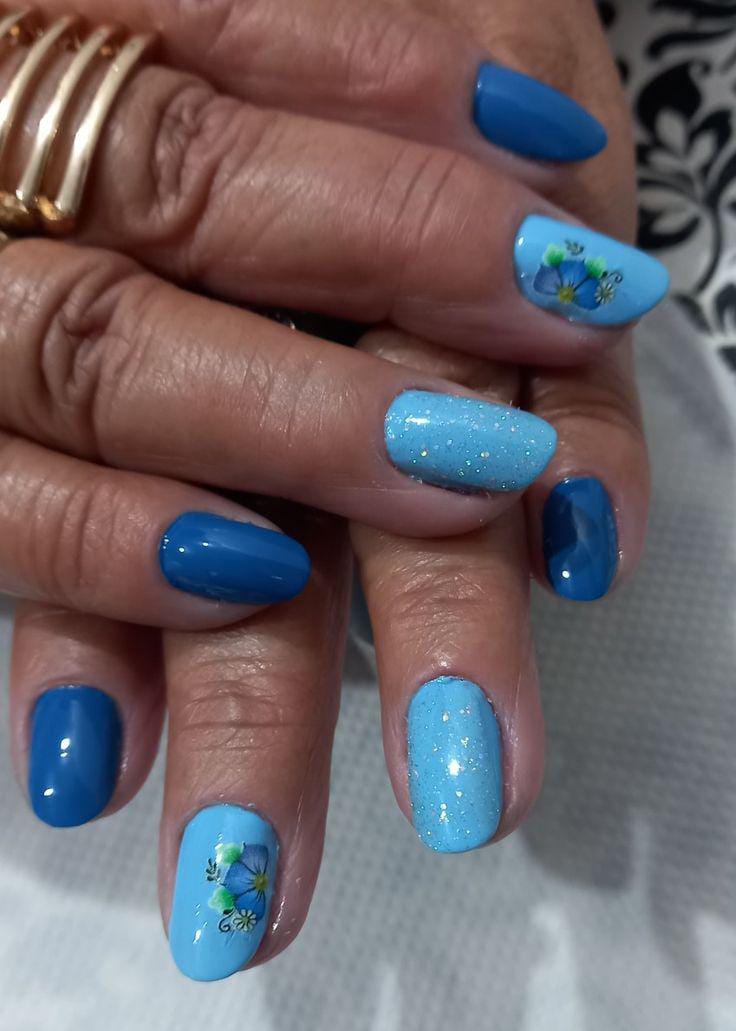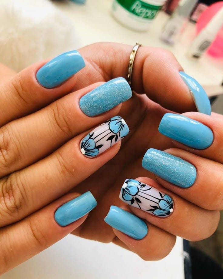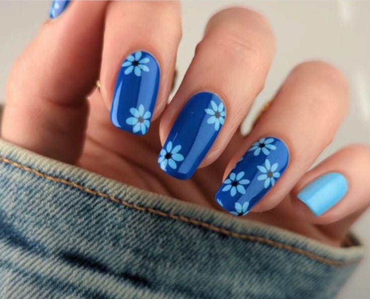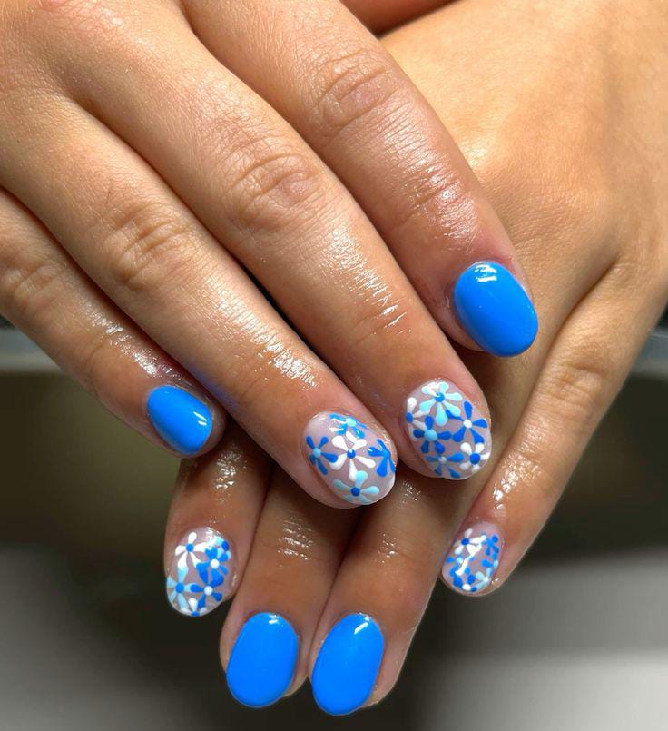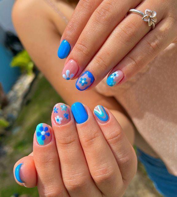 This look combines solid blue nails with floral patterns scattered across accent nails. The design feels lively and youthful, inspired by blooming spring gardens.