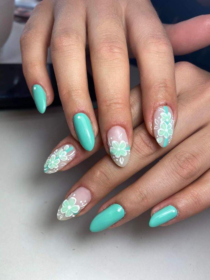 Fresh mint blue nails are nude accents mixed with floral art for a cool and airy finish. The design feels modern, bright, and effortlessly seasonal.