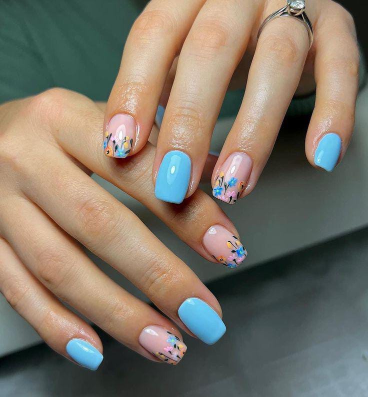 This set combines pastel blue nails with nude bases decorated in simple floral patterns. The overall look is elegant, modern, and very spring-inspired.