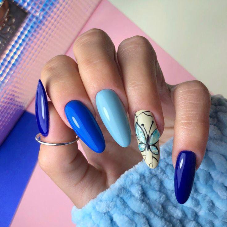 Deep and light blue shades create contrast, with a butterfly accent adding a playful touch. The look feels bold yet graceful, perfect for a statement spring manicure.