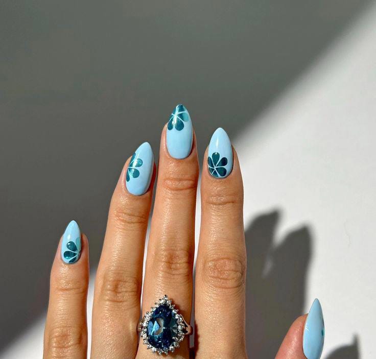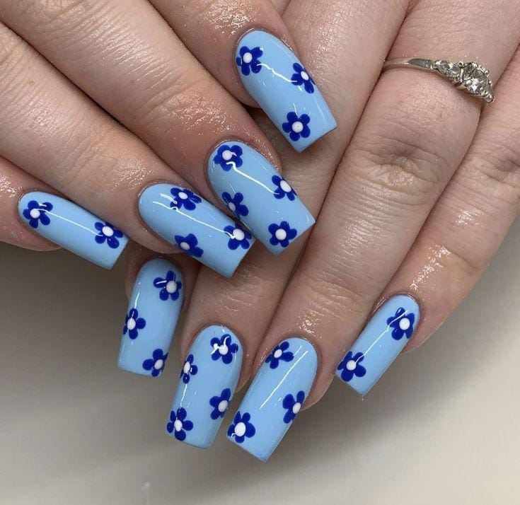 Light blue nails are decorated with small deep-blue floral patterns for a balanced spring feel. The design looks playful yet polished and easy to wear.