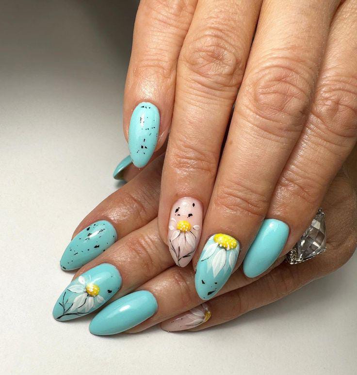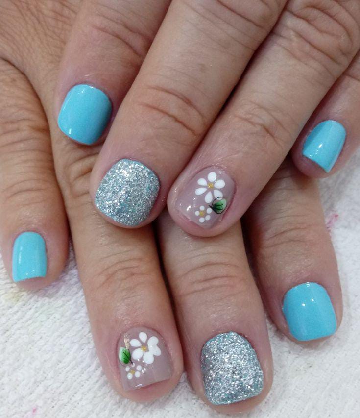 Bright aqua nails are balanced with silver glitter and small white daisy details. It gives a cheerful, playful spring feel with a hint of shine.