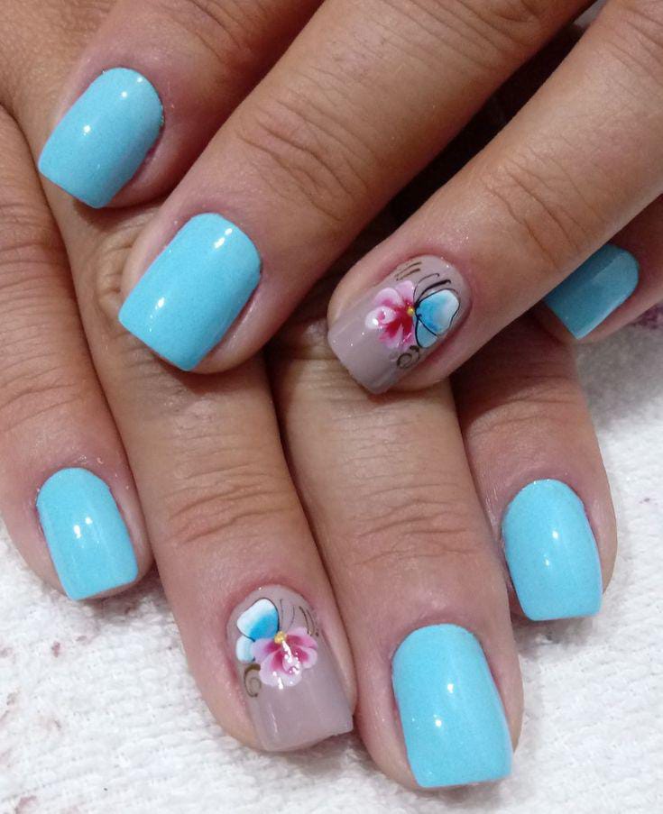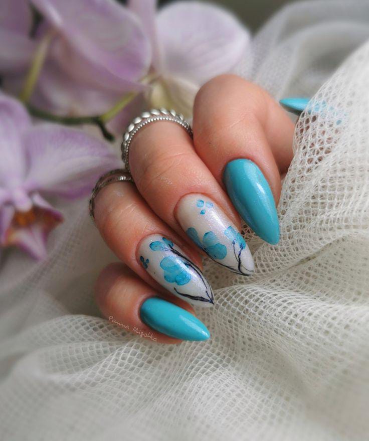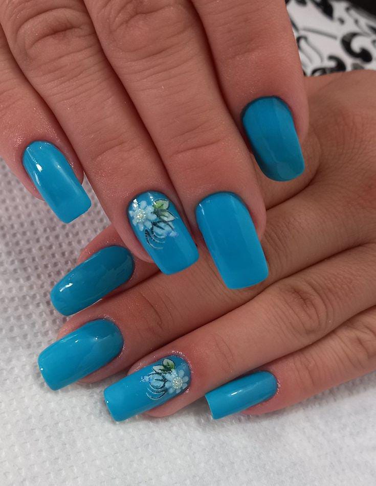Bright aqua-blue nails are enhanced with soft floral detailing on accent nails. The design feels lively, polished, and beautifully seasonal.