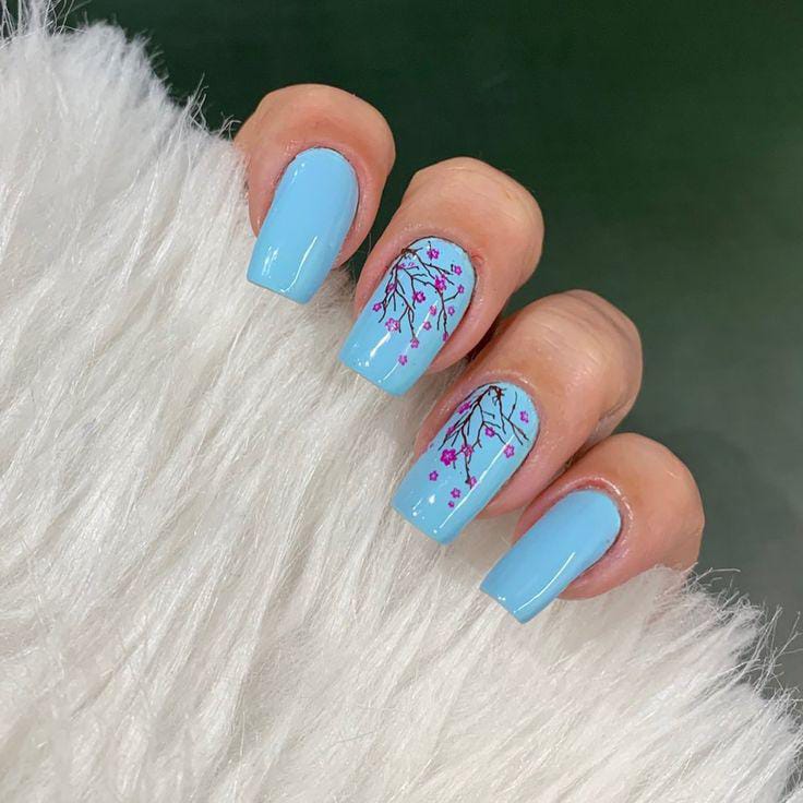 Minimal blue nails are enhanced with fine branch-and-blossom artwork on accent nails. The design feels serene, modern, and inspired by early spring nature.