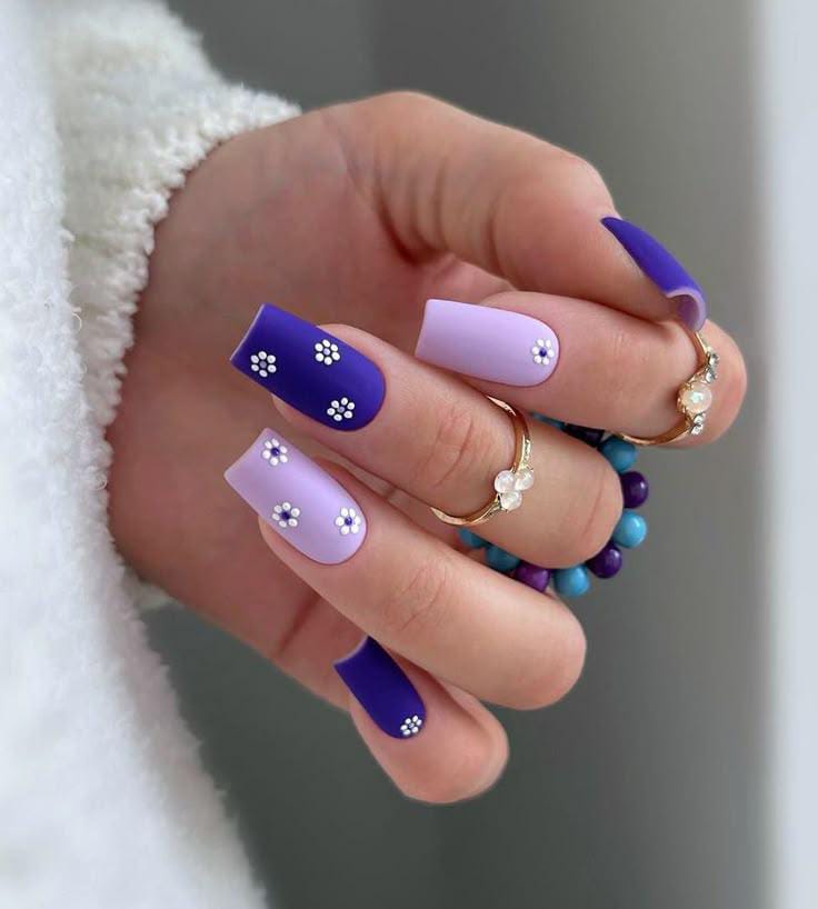 This design mixes pastel lavender and deep blue shades with tiny floral accents. It feels modern, soft, and perfect for a calm spring aesthetic.