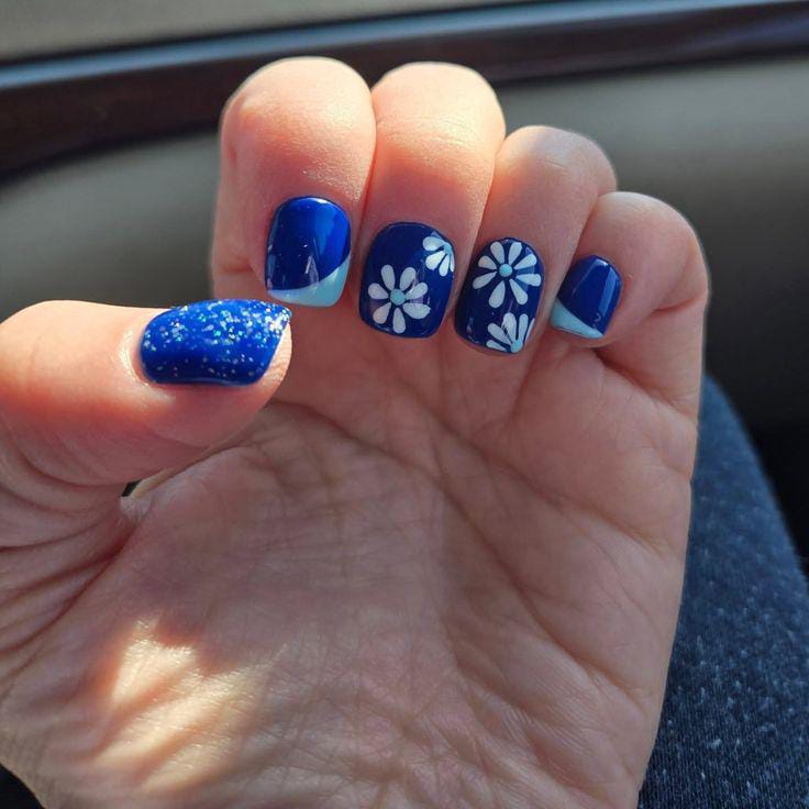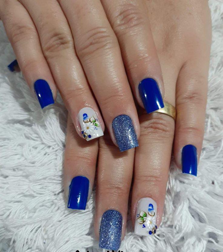 Deep royal blue nails are mixed with glitter textures and white floral art for contrast. The design feels bold yet elegant with a classy spring touch.