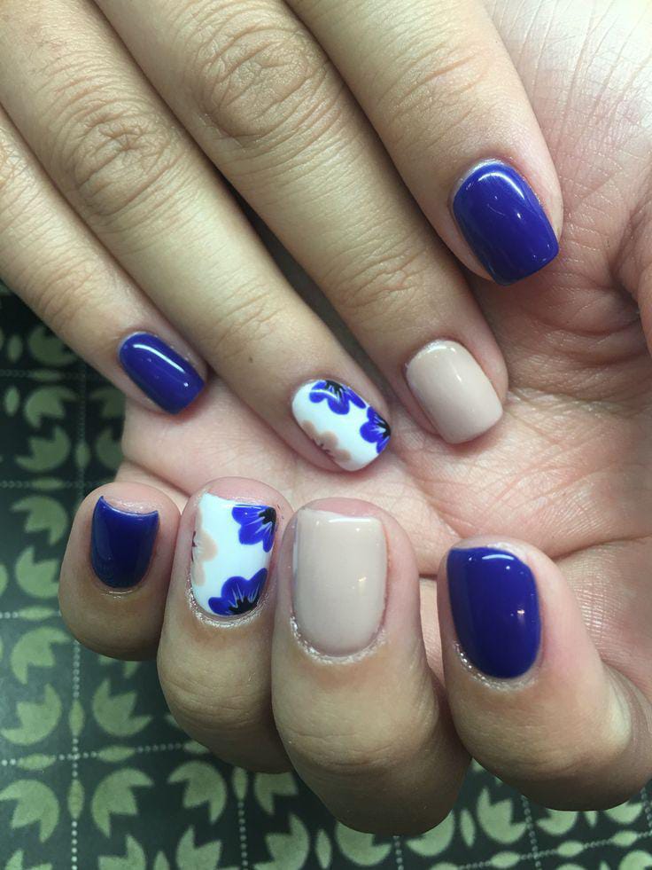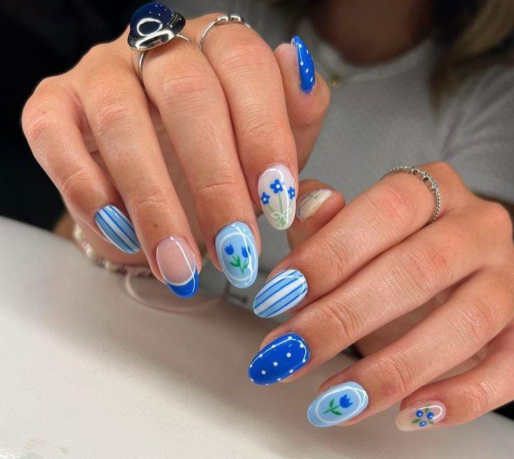 This design mixes bold cobalt blue with soft nude accents and tiny floral patterns. It feels fresh, playful, and perfect for a bright spring look.