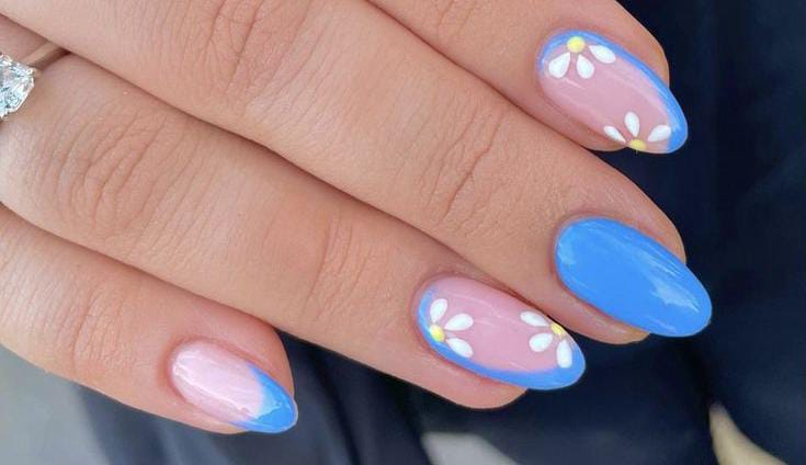 Bright blue nails are combined with soft pink bases and scattered flower art. The design feels outdoorsy, fresh, and effortlessly cute spring vibe.