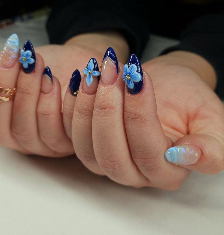 Deep navy French tips are softened with raised blue flower details and a glossy finish. The style feels bold yet romantic, perfect for a statement spring look.