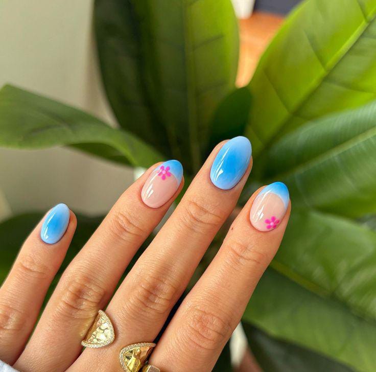 A nude-pink base blends gently into sky-blue tips with small pink flower details. The design feels light, romantic, and effortlessly pretty spring.