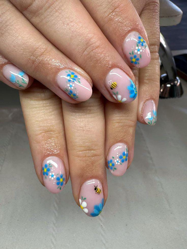 Glossy blush-pink nails feature playful blue flowers and tiny bee details for a whimsical touch. The overall vibe is cute, lively, and full of spring charm.