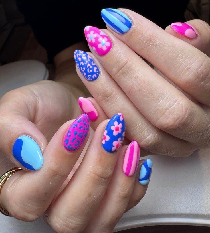 This design mixes bright blue and pink shades with playful florals, stripes, waves, and animal-print accents. The vibe is fun, bold, and perfect for a cheerful spring look.