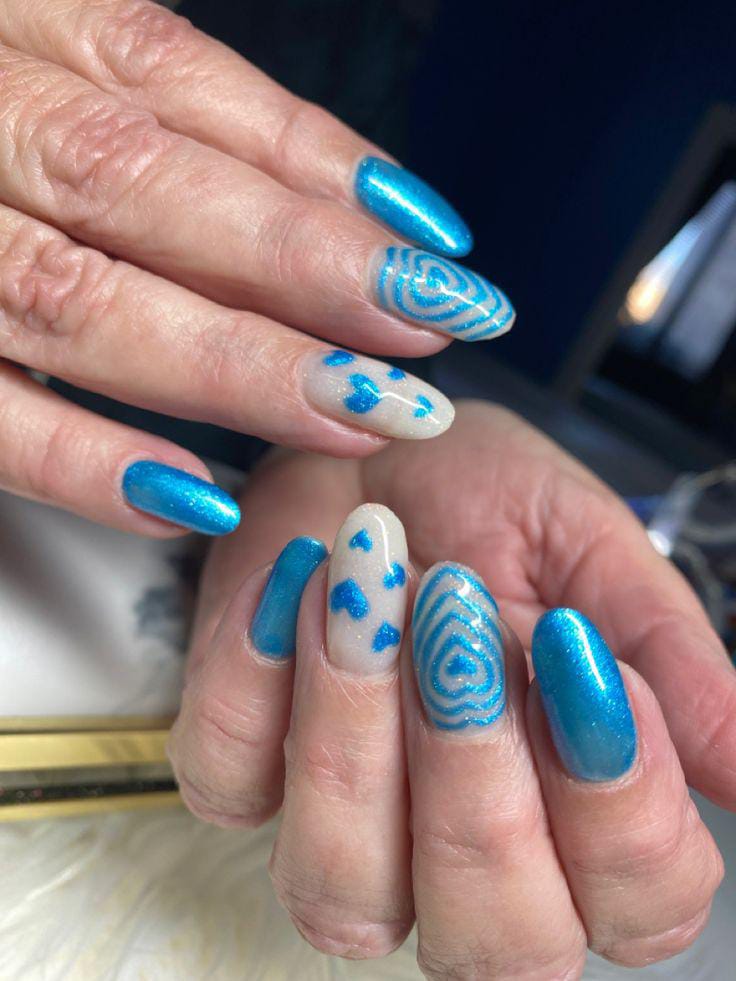 Shimmery blue nails mixed with nude accents and abstract heart patterns create a bold, playful Valentine vibe. The swirling lines add movement and a trendy edge.