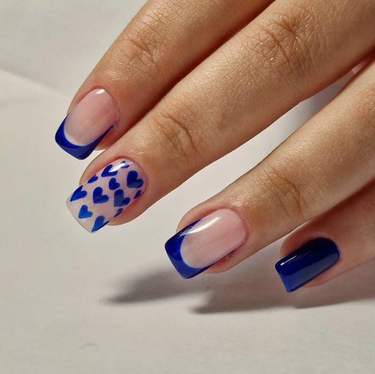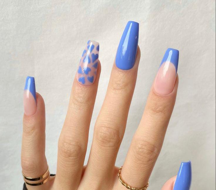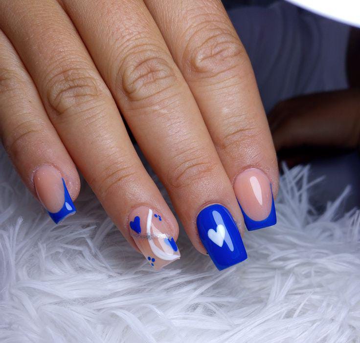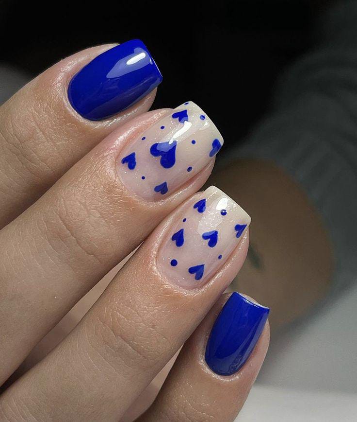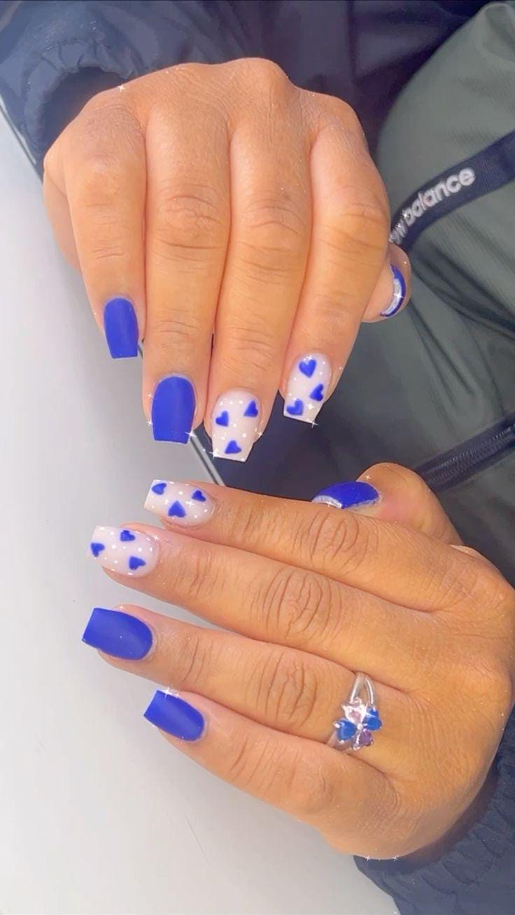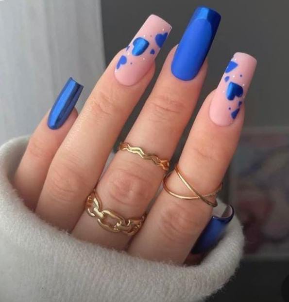 Soft nude and bold blue nails mix together with scattered heart accents for a playful Valentine vibe. The contrast feels fun, flirty, and modern without being overdone.