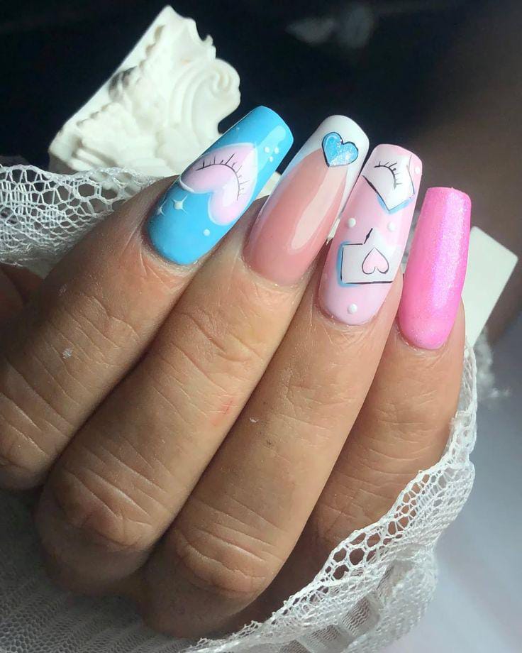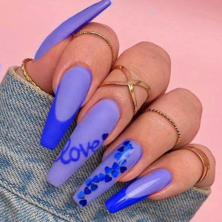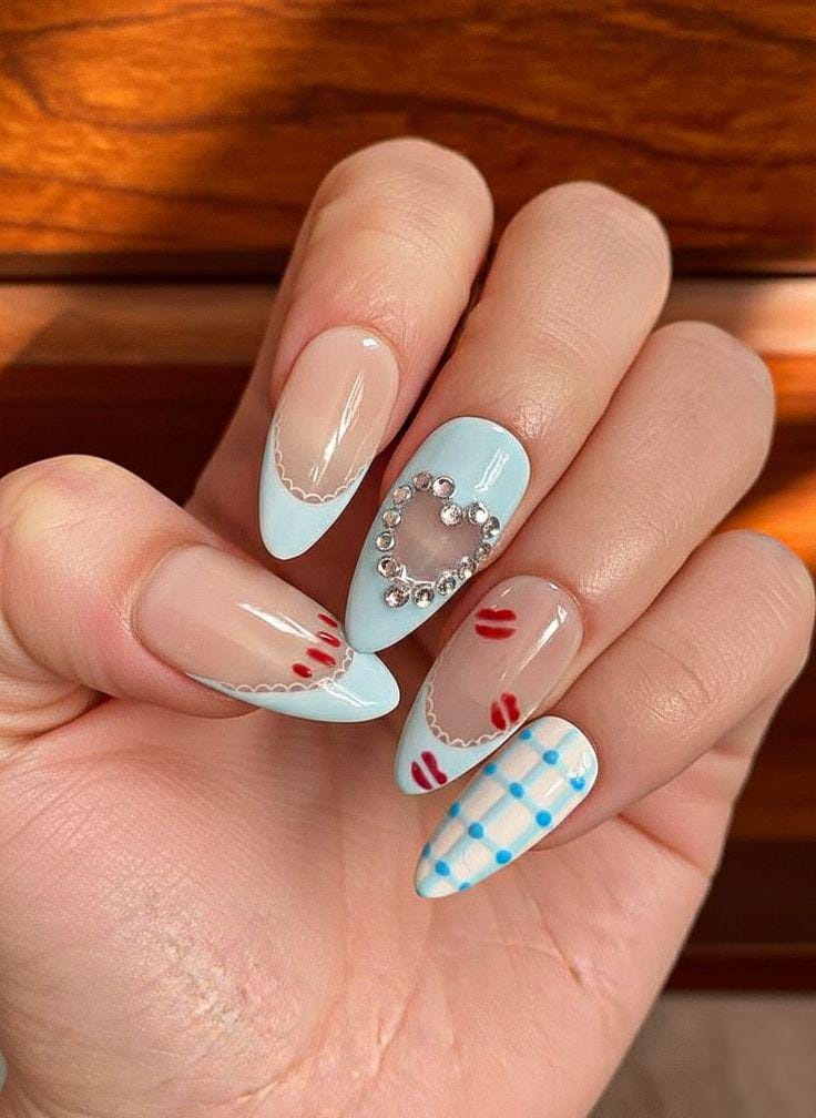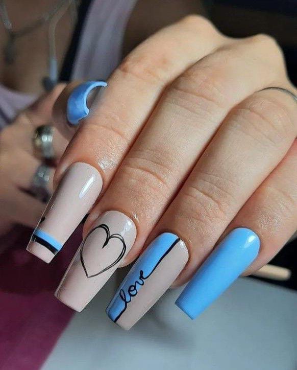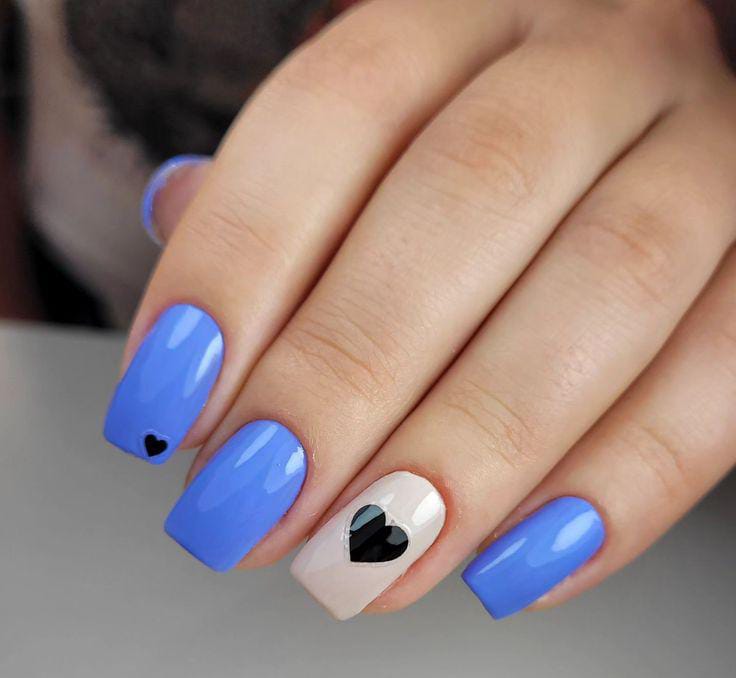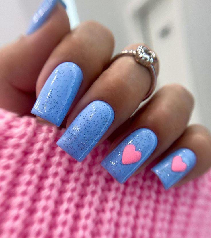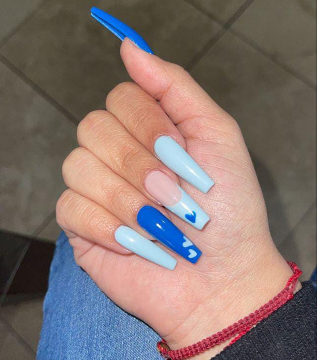 Soft nude and bold blue nails mix together with scattered heart accents for a playful Valentine vibe. The contrast feels fun, flirty, and modern without being overdone.
