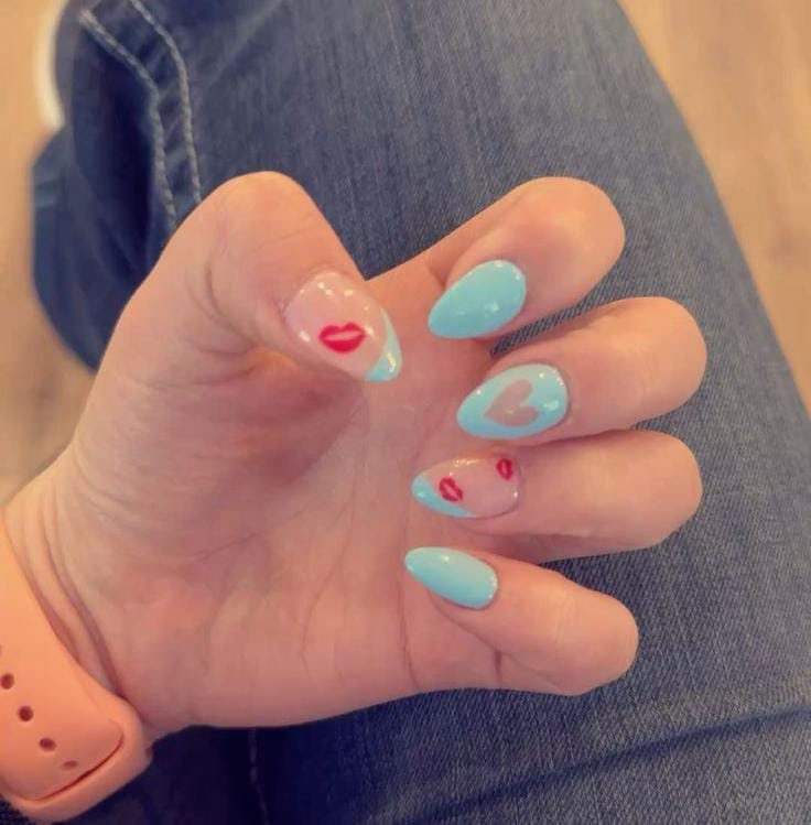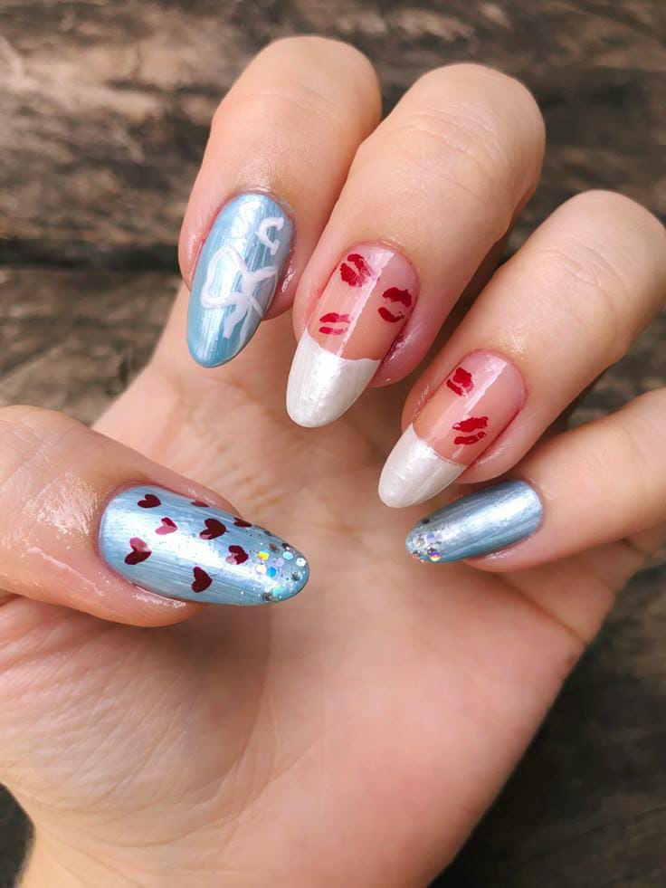 Baby blue polish combined with nude accents, heart and tiny lip prints creates a fun, flirty design. The overall look is modern, cute, and perfect for a casual Valentine style.