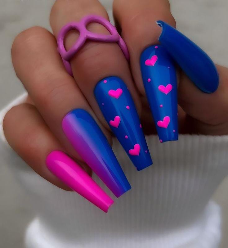 Bright blue and hot pink shades blend together for a fun, high-energy Valentine vibe. Small pink hearts add a playful, flirty touch that feels youthful and bold.