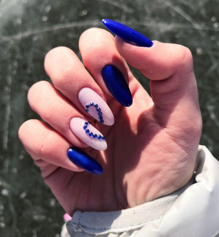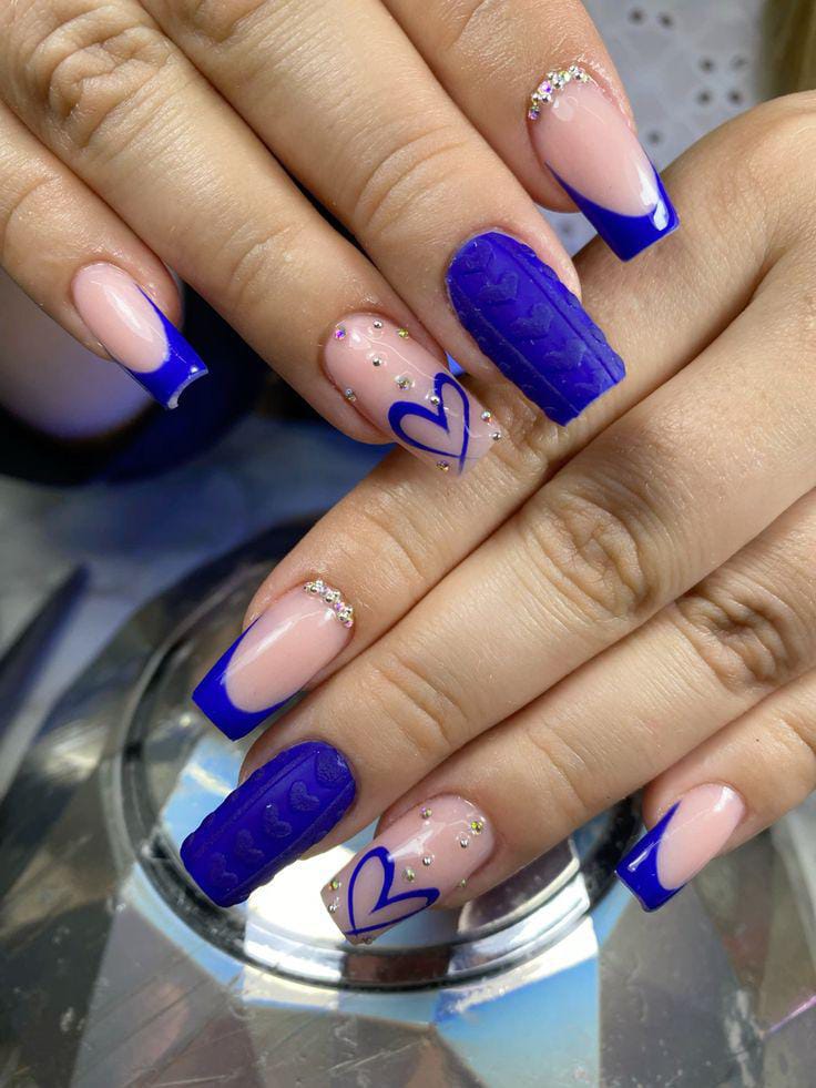 This design mixes deep cobalt blue with soft blush-pink nails, finished with delicate rhinestone heart accents. The vibe is elegant and romantic with a bold, polished Valentine’s feel.