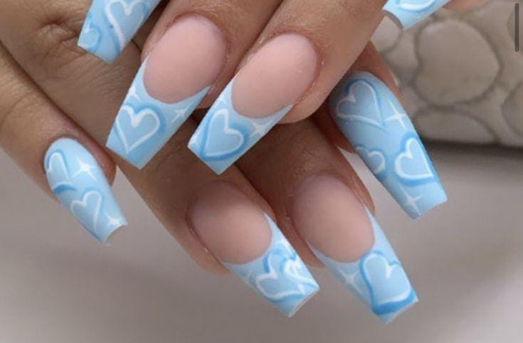 A sheer nude base with light blue heart-patterned French tips gives this design a soft and airy appearance. It feels delicate, fresh, and ideal for a Blue Valentine aesthetic.