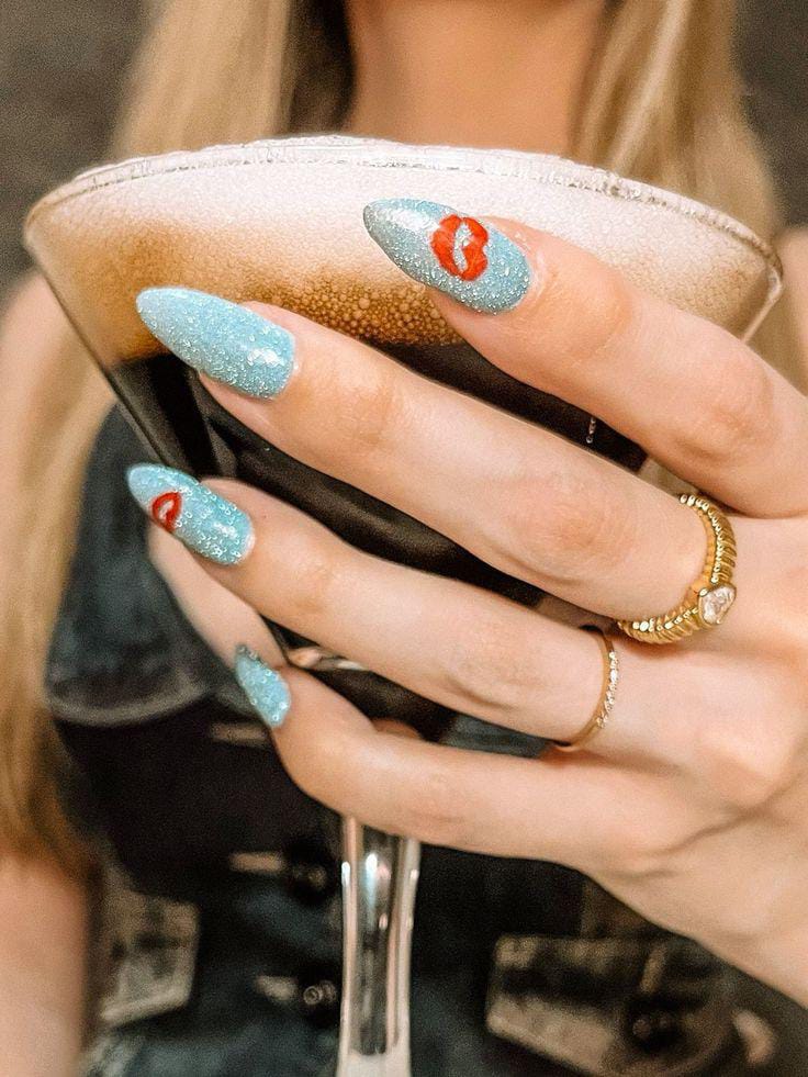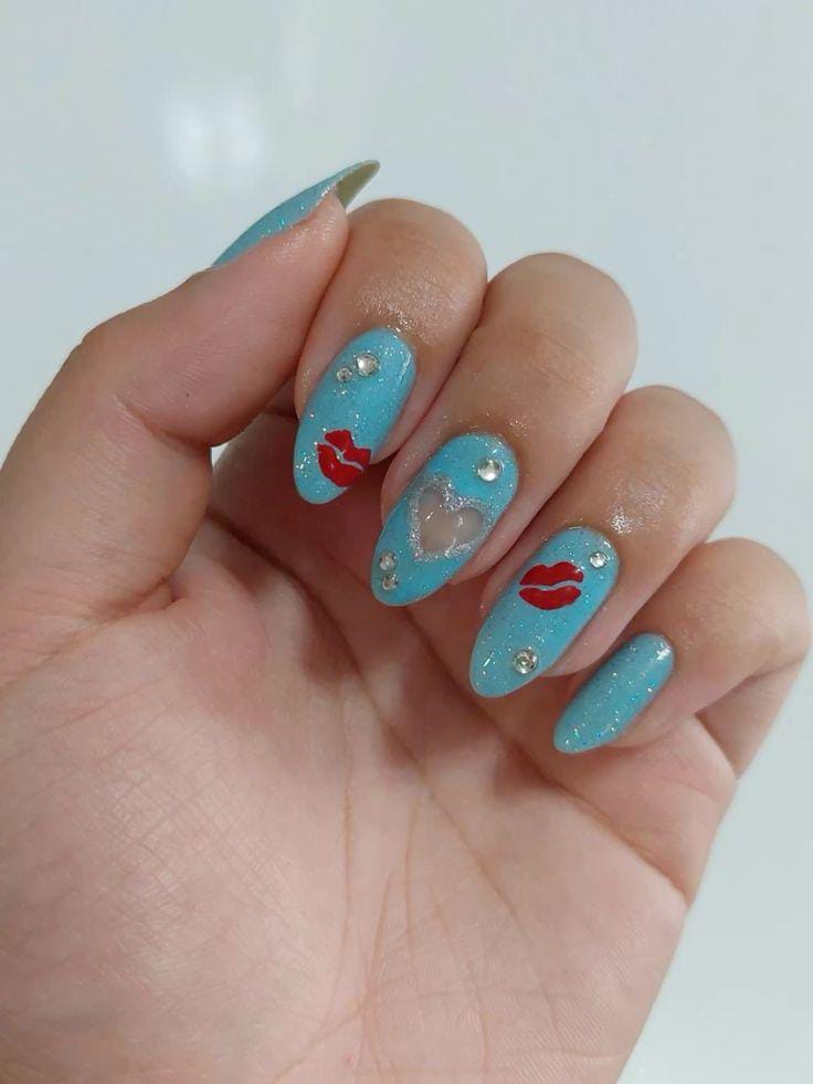 Glittery blue nails with tiny lip details bring a bold and flirty Valentine feel. The shimmer adds glamour while the playful accents keep it fun and romantic.