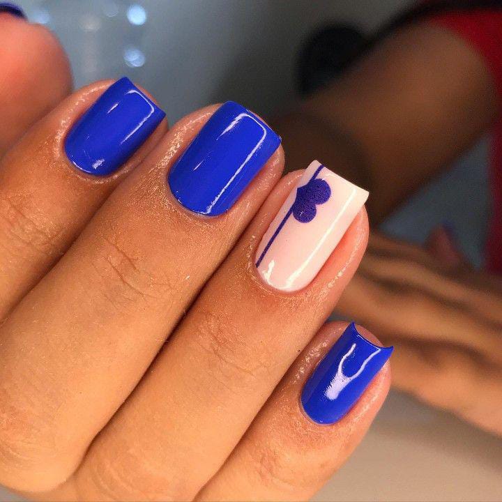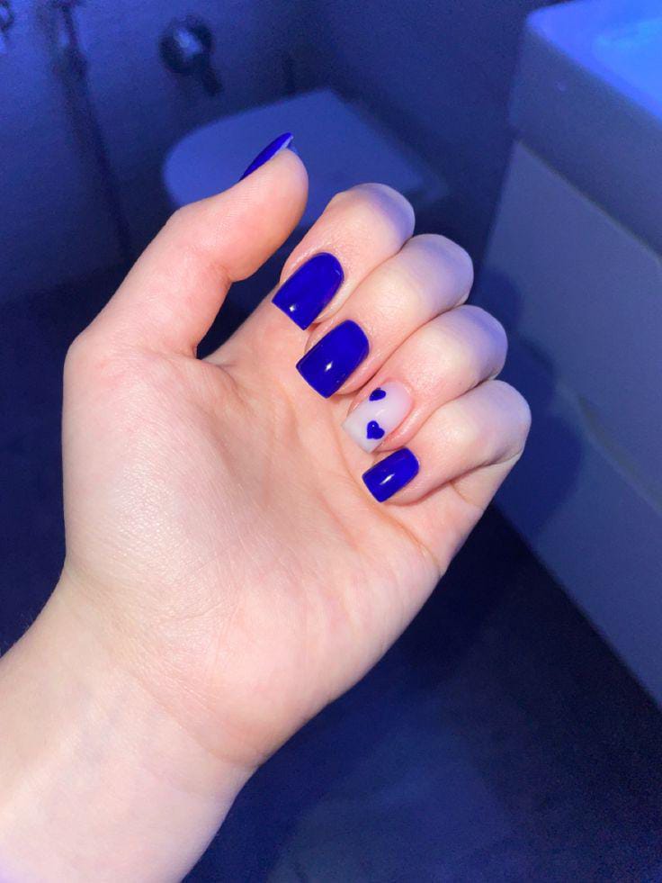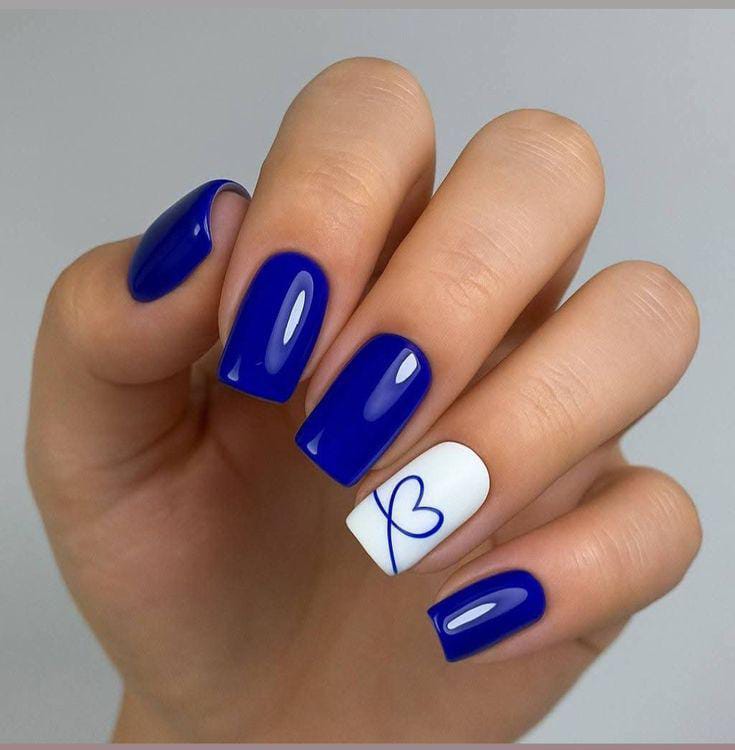 Rich royal blue nails dominate this look, accented by a single white heart for contrast. The vibe is bold yet sweet, making it a standout Valentine’s design.