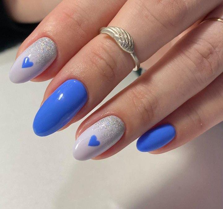 Bright blue nails are balanced with silver glitter accents and small blue hearts on a white milky base for a clean, modern Valentine’s style. The overall look is chic, simple, and softly romantic.