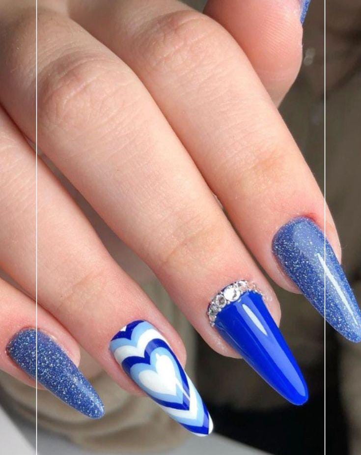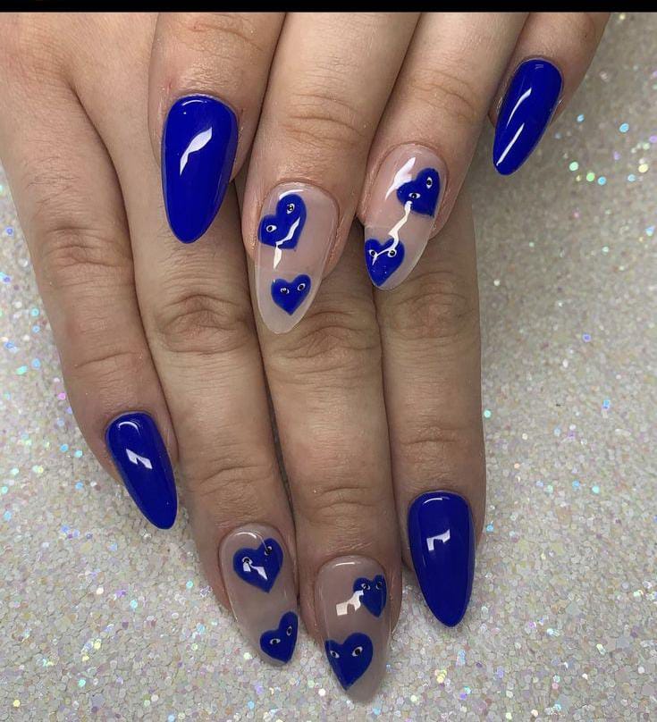 Bold royal blue nails mixed with heart patterns and glitter accents create a striking, glamorous look. The design feels confident, festive, and full of Valentine’s love.