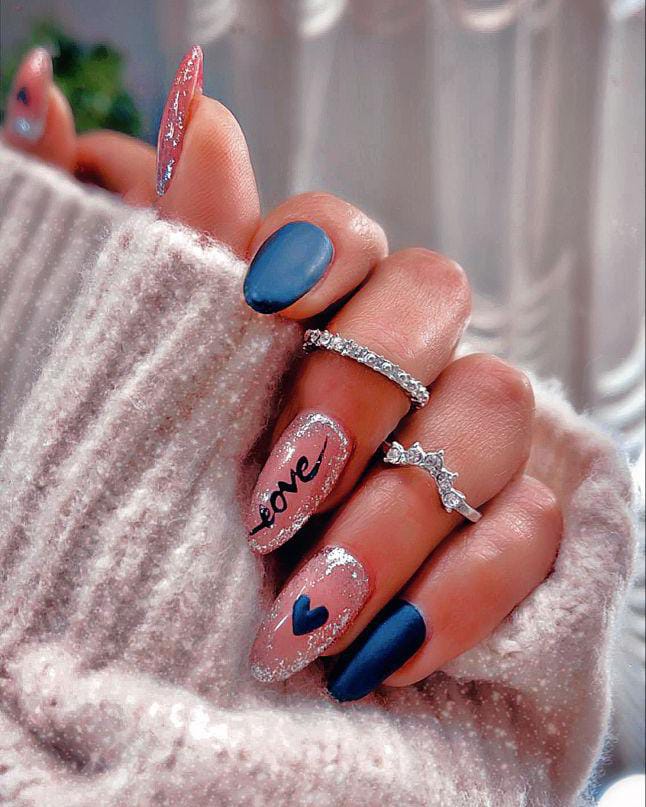 A mix of deep blue and nude nails with cute heart art gives this set a fun, flirty Valentine vibe. The glossy finish keeps it fresh and modern.