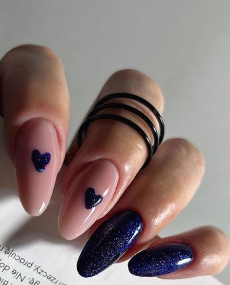 Soft nude almond-shaped nails are paired with deep navy blue accents and small heart designs. The look feels elegant and flirty, perfect for a chic Valentine’s aesthetic.