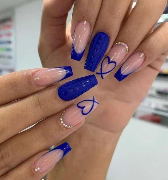 This set combines nude bases with vivid blue French tips, textured sweater-style nails, and hand-drawn heart accents. It gives a cozy yet stylish Valentine’s vibe with a creative twist.