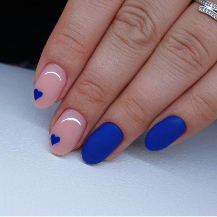 Matte cobalt blue nails are balanced with nude nails featuring simple blue heart accents. The overall look is minimal, sweet, and modern with a soft romantic Valentine’s touch.