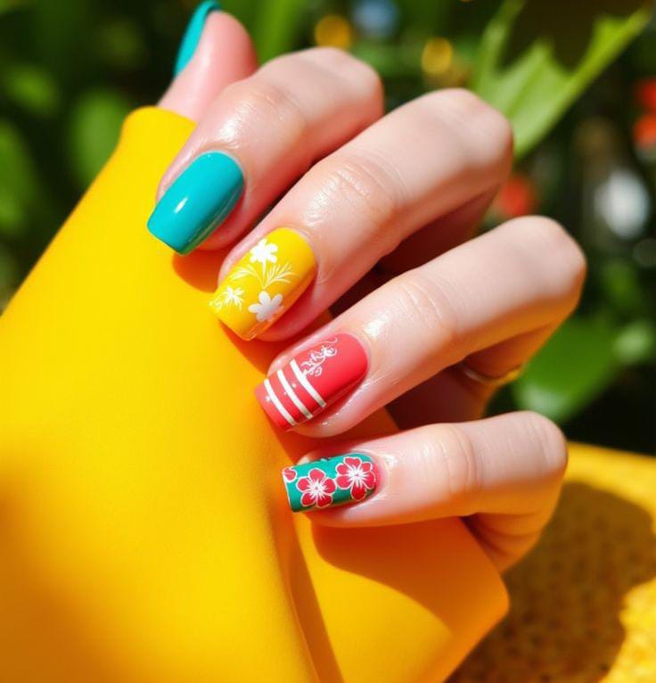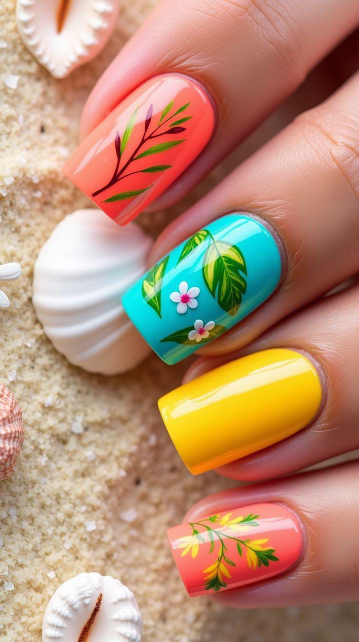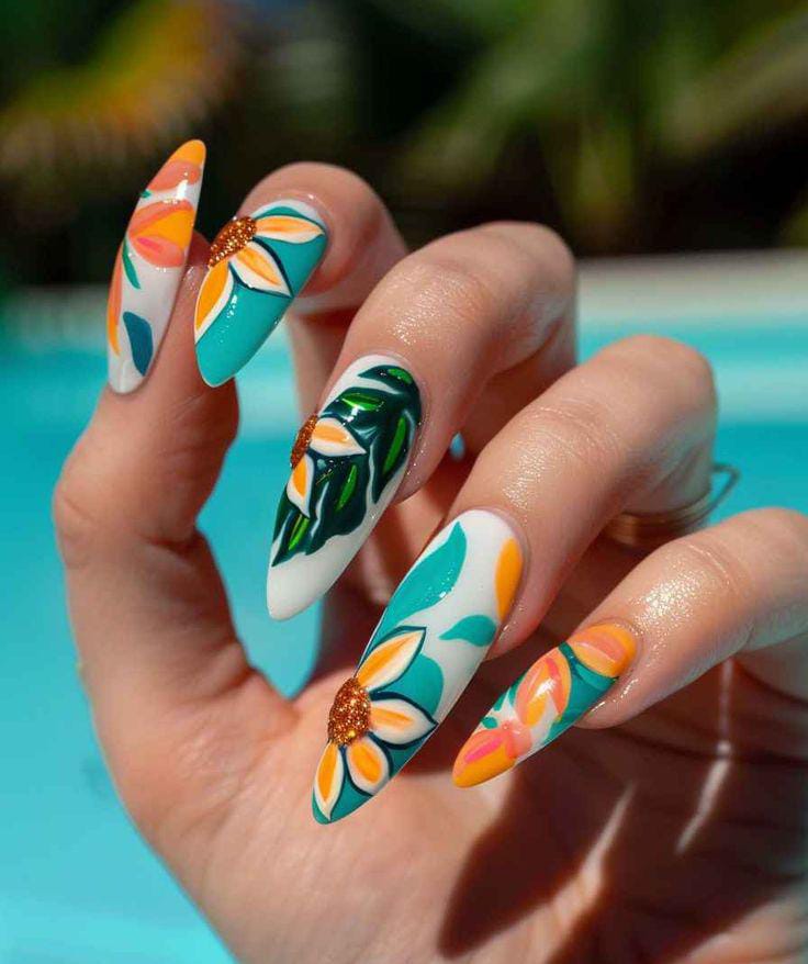 These nails feature a bold tropical floral theme with teal, white, green and warm orange tones. The hand-painted flowers and leafy accents give off a fresh, vacation-ready summer vibe that feels lively and artistic.