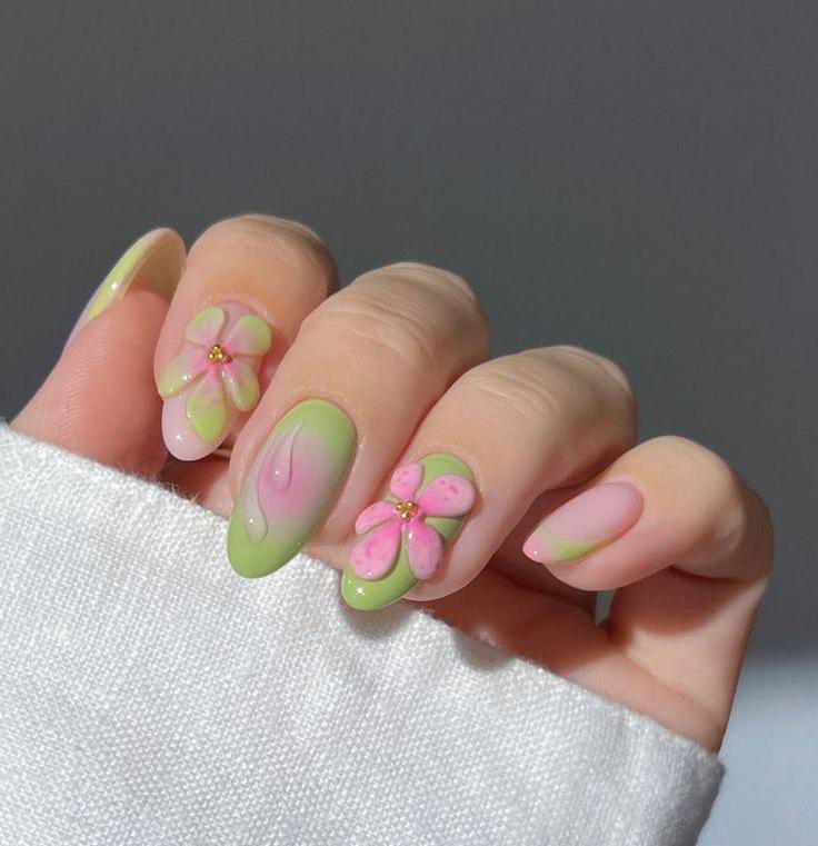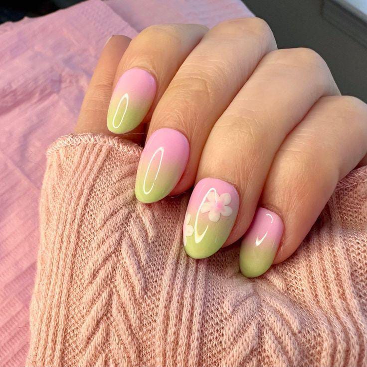 Soft pink and green ombré nails create a smooth, dreamy gradient, paired with delicate floral accents. The look feels light and airy but still eye-catching, perfect for a sweet yet bold summer style.