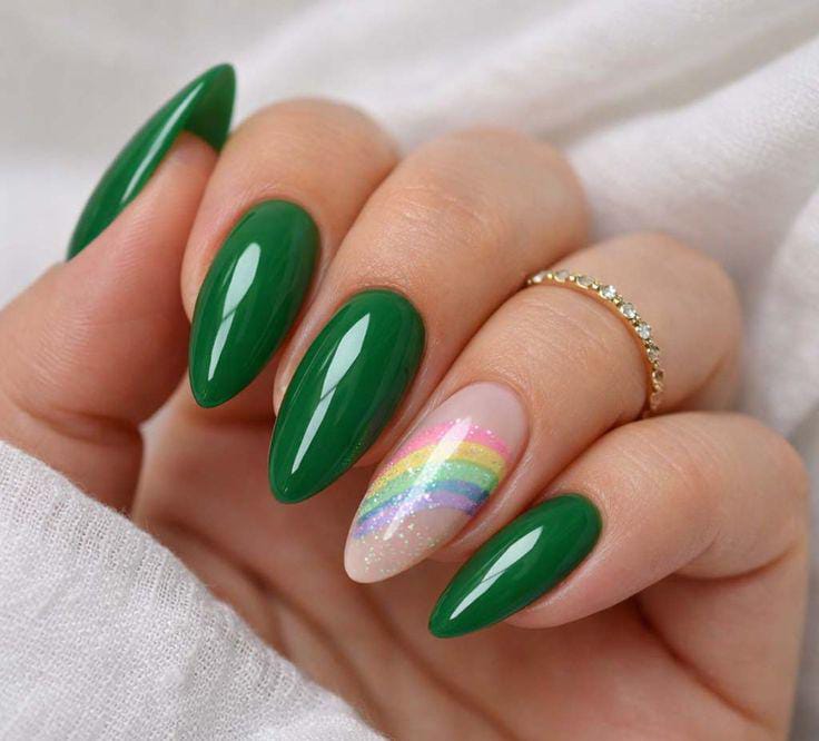 Deep glossy green nails make a bold statement, balanced by a subtle nude accent with a soft rainbow shimmer. The vibe is chic and confident, blending rich color with a fun, bold summer twist.