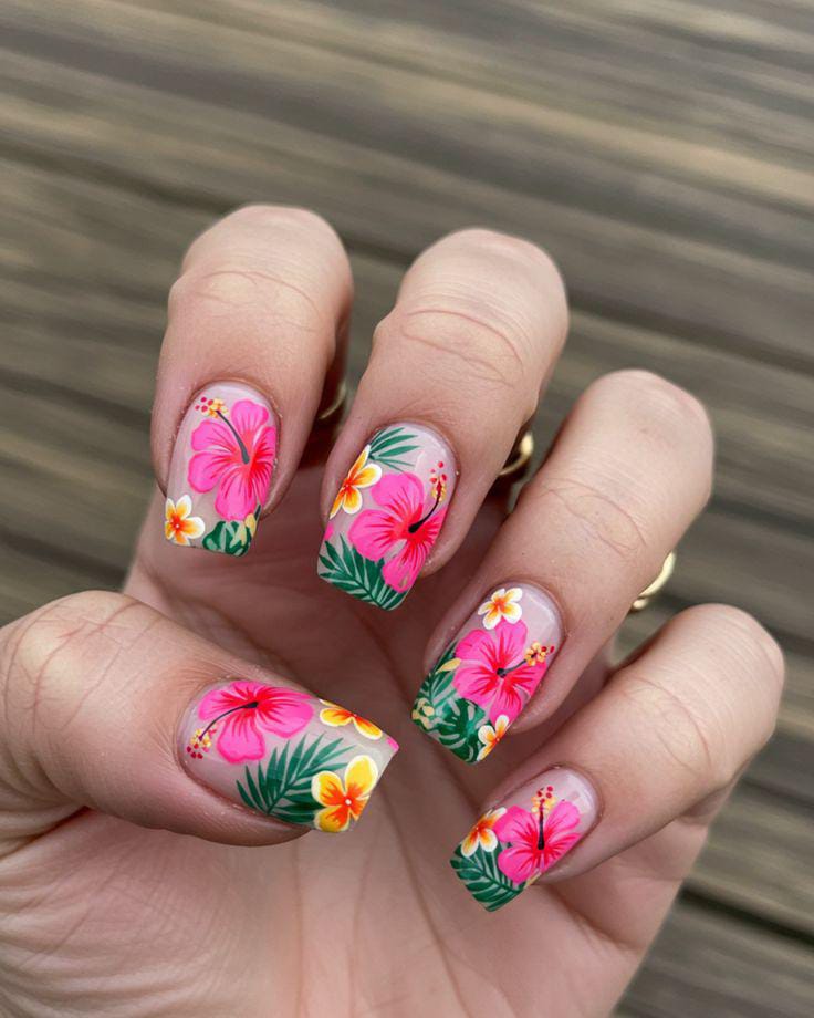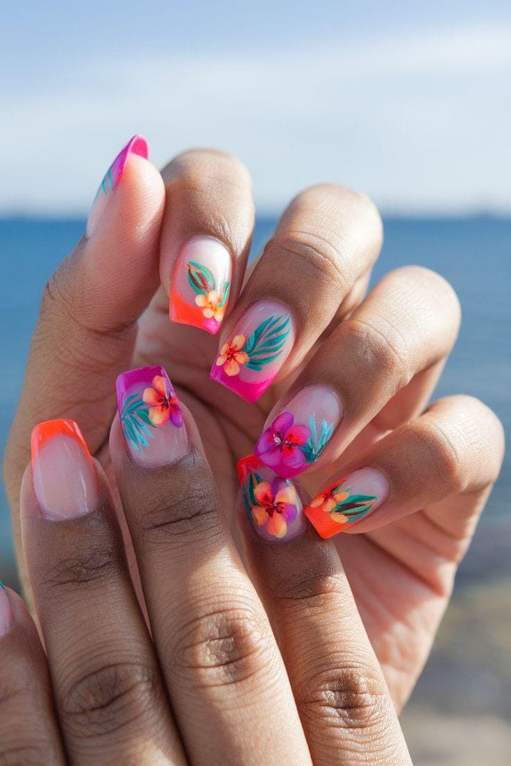This design features bright pink and coral tips with hand-painted tropical flowers and leafy accents. The overall vibe is vibrant and beachy, perfect for bold summer vacations and sunny days.
