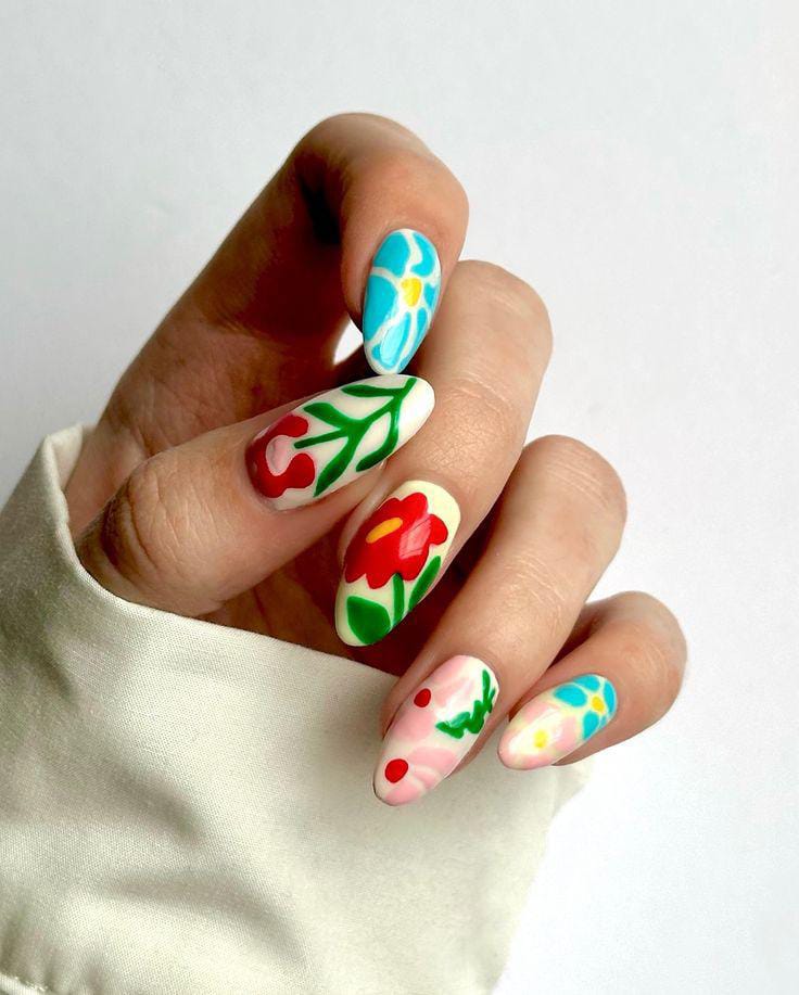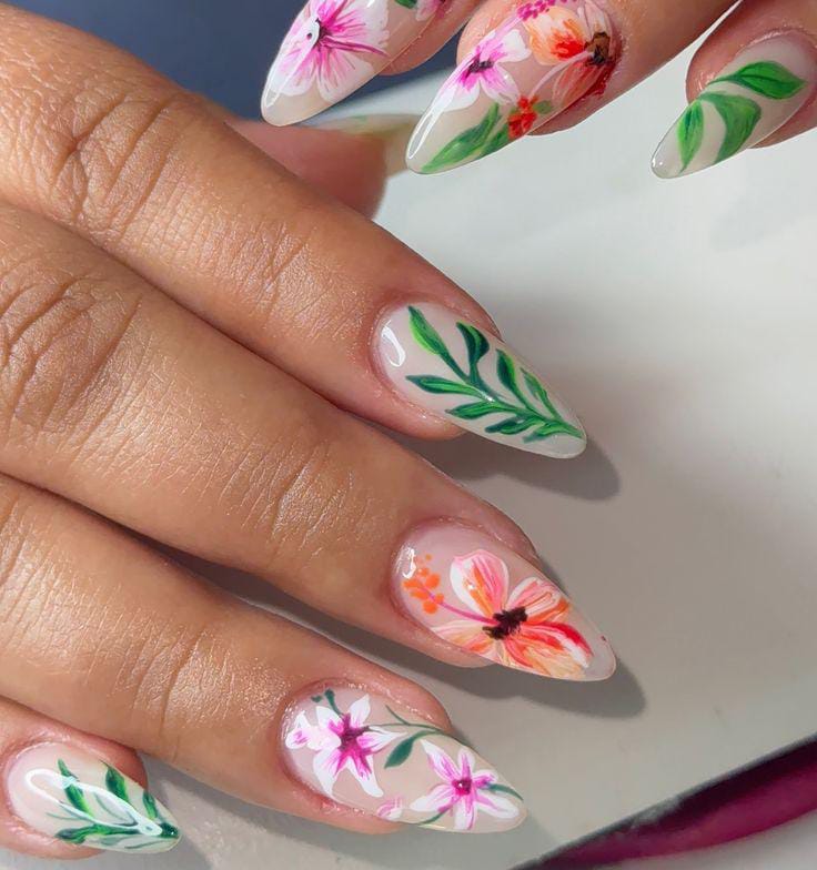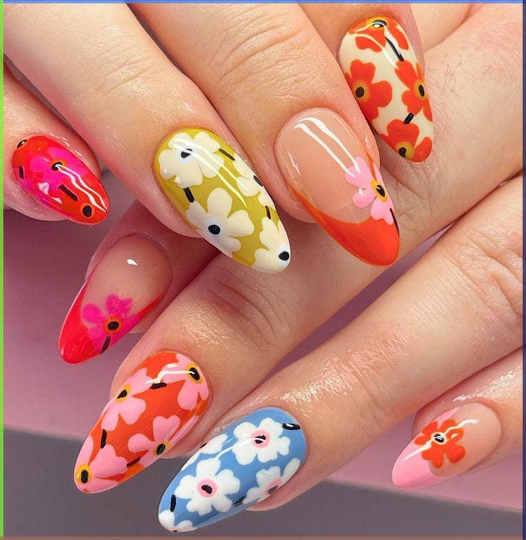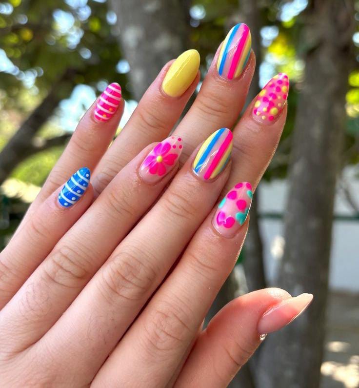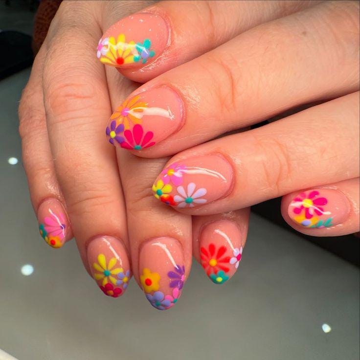 These nails feature a sheer nude base covered with bright, playful floral patterns in pastel and neon shades. The overall vibe is cheerful, artsy and bold, perfect for summer days that call for color without feeling too heavy.